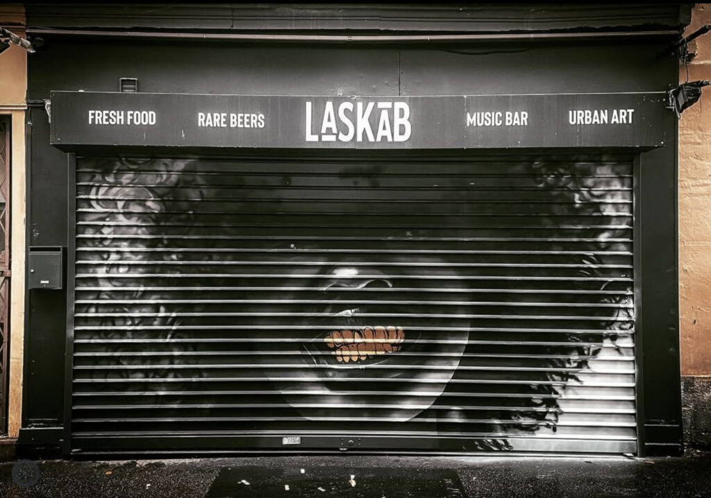 J’ai eu l’immense plaisir de me voir offrir une carte blanche par le bar à cocktail LASKAB (désormais fermé, hélas) pour participer à l’identité du lieu sous la forme d’une peinture murale à l’intérieur (un portrait de l’immense Nina Simone) et d’une peinture XXL à l’extérieur, sur le rideau de fer, un portrait de la mannequin américaine Dosha Deng. Ce fut une belle opportunité de sortir de ma pratique artistique habituelle tout en sublimant un lieu et en rendant un hommage à des femmes fortes.
